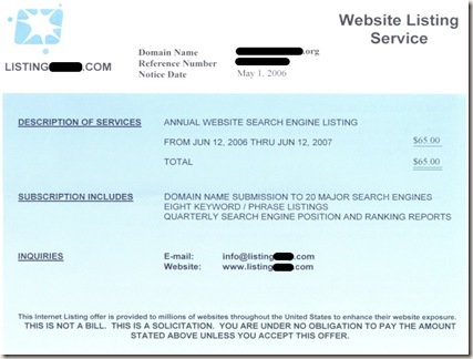 Mail adreslerine ısrarlı ricalar(talepler) gelen ve buna hala şaşıran insanlar olduğunu duyuyorum. İşte talep örneklerinden biri:İlk bakışta, ödenmesi gereken "Yıllık website arama motoru listelemesi" için kesilmiş fatura gibi görünen bu yarı resmi mektup, alttaki küçük puntolarla yazılmış olan yazıyı gördüğümüzde bizi kandırmaya yönelik olduğunu anlıyoruz.